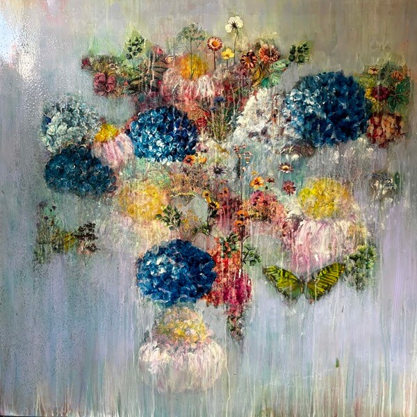 Her work can be feminine and always displays flowers or garden themed gestures, butterflies, orbs, birds or bees are always present. A thick layer of gloss is the last application as it enhances the layers built up, which showcases all the layers. Her works are extremely rich in colour, shimmer powders are added to give a sparkle in the night light of your home in the evening.